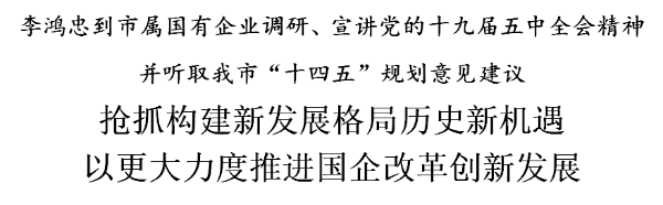 本報訊(記者 魏彧 于春灃)17日,市委書記李鴻忠深入市屬國有企業(yè)調(diào)研、宣講黨的十九屆五中全會精神,并聽取我市“十四五”規(guī)劃意見建議。李鴻忠強調(diào),要堅持以習近平新時代中國特色社會主義思想為指導,認真學習貫徹黨的十九屆五中全會精神,深入貫徹新發(fā)展理念,搶抓構(gòu)建新發(fā)展格局歷史新機遇,找準自身定位,毫不動搖鞏固和發(fā)展公有制經(jīng)濟,以更大的力度推動國企改革創(chuàng)新發(fā)展,切實促進國有企業(yè)不斷做強做優(yōu)做大。