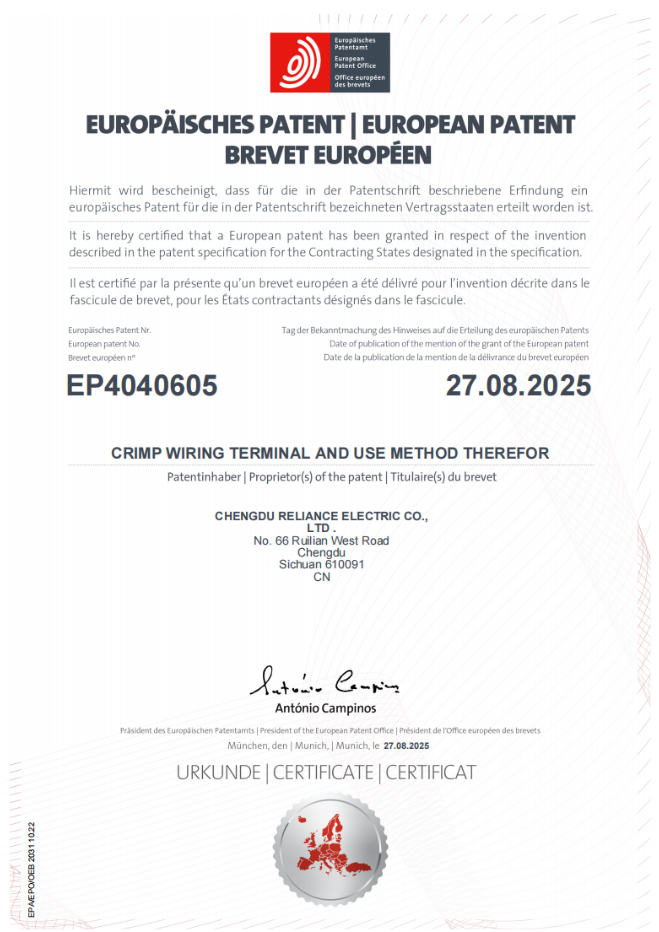 【瑞聯(lián)電氣產(chǎn)品歐洲發(fā)明專利證書】